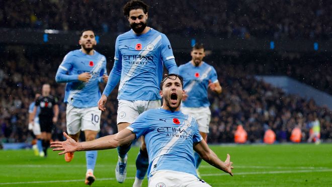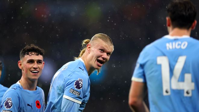 曼城首发:25-多纳鲁马、3-鲁本·迪亚斯、24-格瓦迪奥尔、33-奥赖利、27-努内斯、4-尼科·冈萨雷斯、20-B席、10-谢尔基、11-多库、47-福登、9-哈兰德。