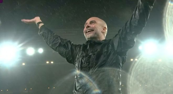 第63分钟,多库禁区外轰出世界波,迎来执教生涯1000场里程碑的瓜帅在雨中张开双臂,纵情庆祝。